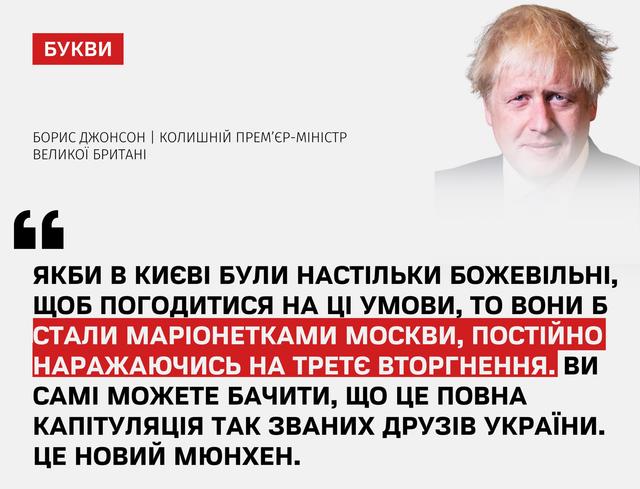 Джонсон наголосив, що план передбачає відмову від Криму й Донбасу, втрату великих територій і фактичне російське вето на вступ України в НАТО.