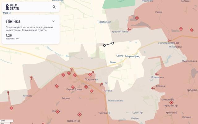 ‼️ 1,5 (!) км залишилося до повного «кільця» в Мирнограді, у районі Покровська, — дані DeepState...