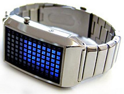 Часы №1 в Японии! Хит продаж. 6 колонок с 72 диодами. Первая колонка (12 диодов) - часы, остальные 5 колонок (60 диодов) - минуты. Часы отображают время и дату. Корпус из латуни, покрыт хромом. Минеральное стекло. Водонепроницаемость 30 метров. В период с 6 часов вечера до 1 часа ночи, каждые 2 минуты на часах по спирали загораются все диоды. Также после нажатия кнопки индикации времени в течении дня, 6 раз через 2 минуты диоды автоматически вспыхивают спиралью. Размер корпуса - 31 mm x 54 mm x 12 mm Максимальный размер запястья - 210 mm Вес - 130 г