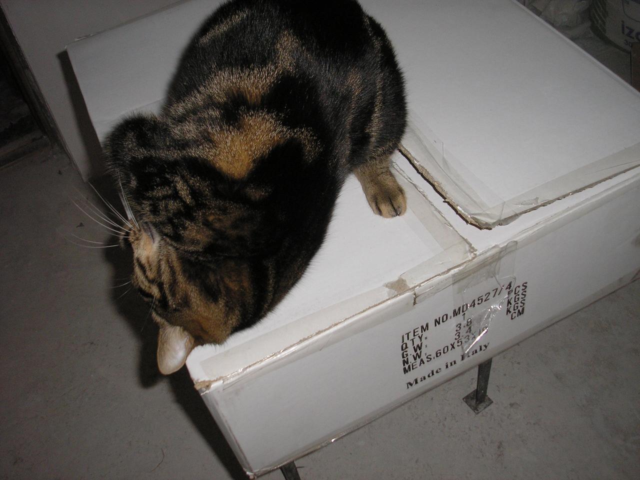 Фотка. сим-сим откройся..застукала Пусю за вскрыванием коробки с новой люстрой.