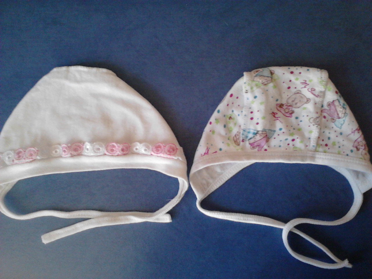 Шапочки для новорожденного малышика. Обе с начесиком внутри. Думаю, до 1 мес. Мы одели по 2 раза.