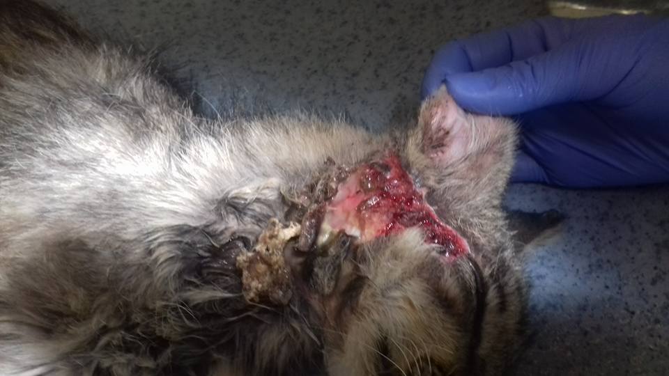 Кота поймали во время - процесс гниения раны еще не успел распространится во внутренние слои (шеи и челюсти). Но места где у котов щека - у него нет, к сожалению.. Лечение уже назначили , это антибиотикотерапия , иммуностимуляторы + обработка раны.
