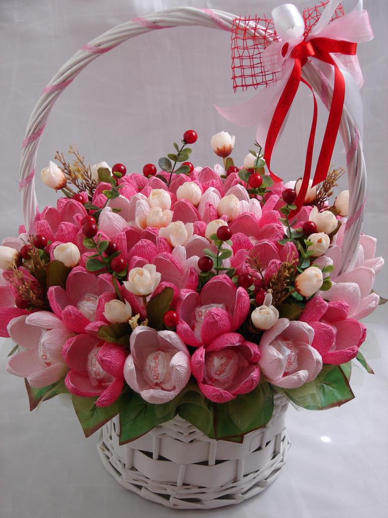 Высота подарка 28см.В состав подарка входят шоколадные конфеты:монетки,Elegance(шоколадки)"Roshen",1 конфета ferrero rocher (в цветке)