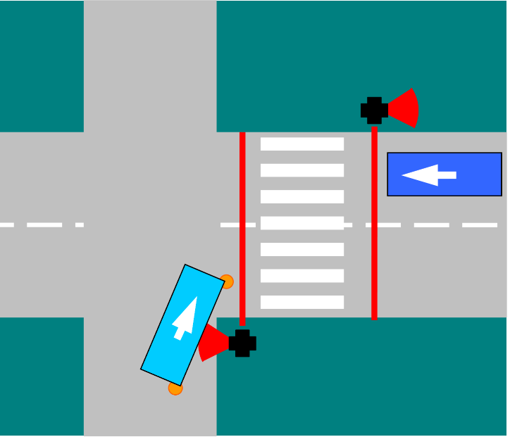В рассматриваемом же случае, условные красные линии пересекать нельзя, как бы машина не ехала: хоть справа-налево, хоть слева-направо, хоть снизу, хоть сверху. Потомучто этот светофор, регулирующий движение на пешеходном переходе, не имеет к перекрёстку никакого отношения.