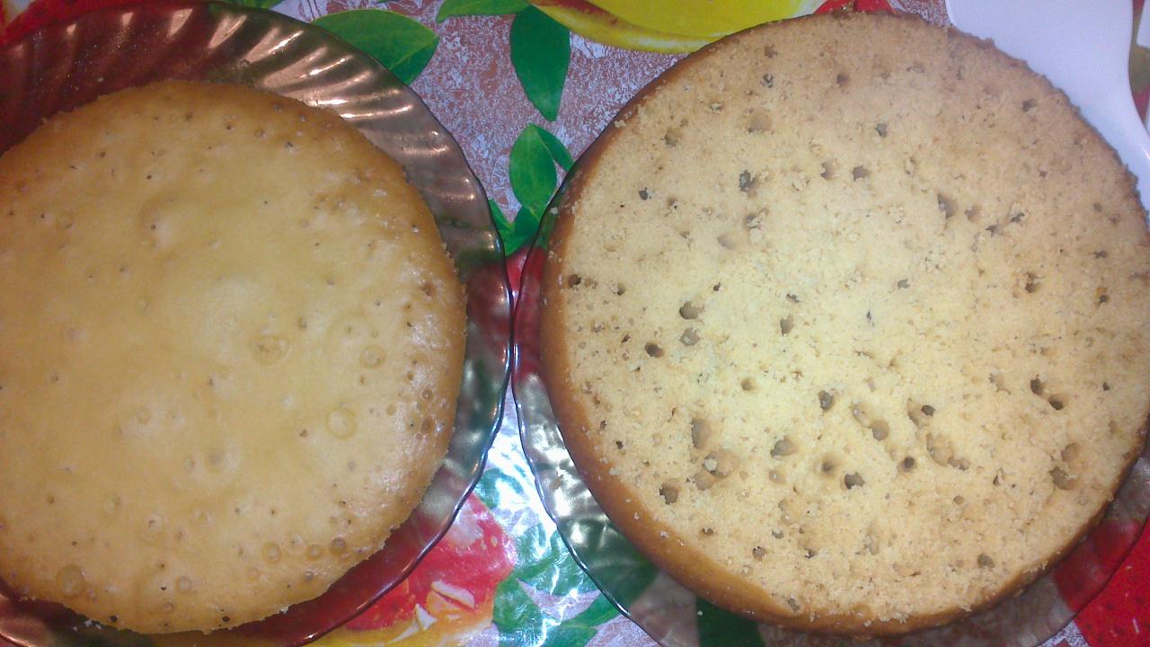 Сейчас разрезала длинным ножом. На 5 коржей. Легко. Можно при желании и на большее количество поделить. Кусочек попробовала. Вкусный, мягкий рыхлый. Можно и в виде пирога есть. Но с кремом, конечно же, будет вкуснее )) Вот какой мякиш. Всё кликабельно.