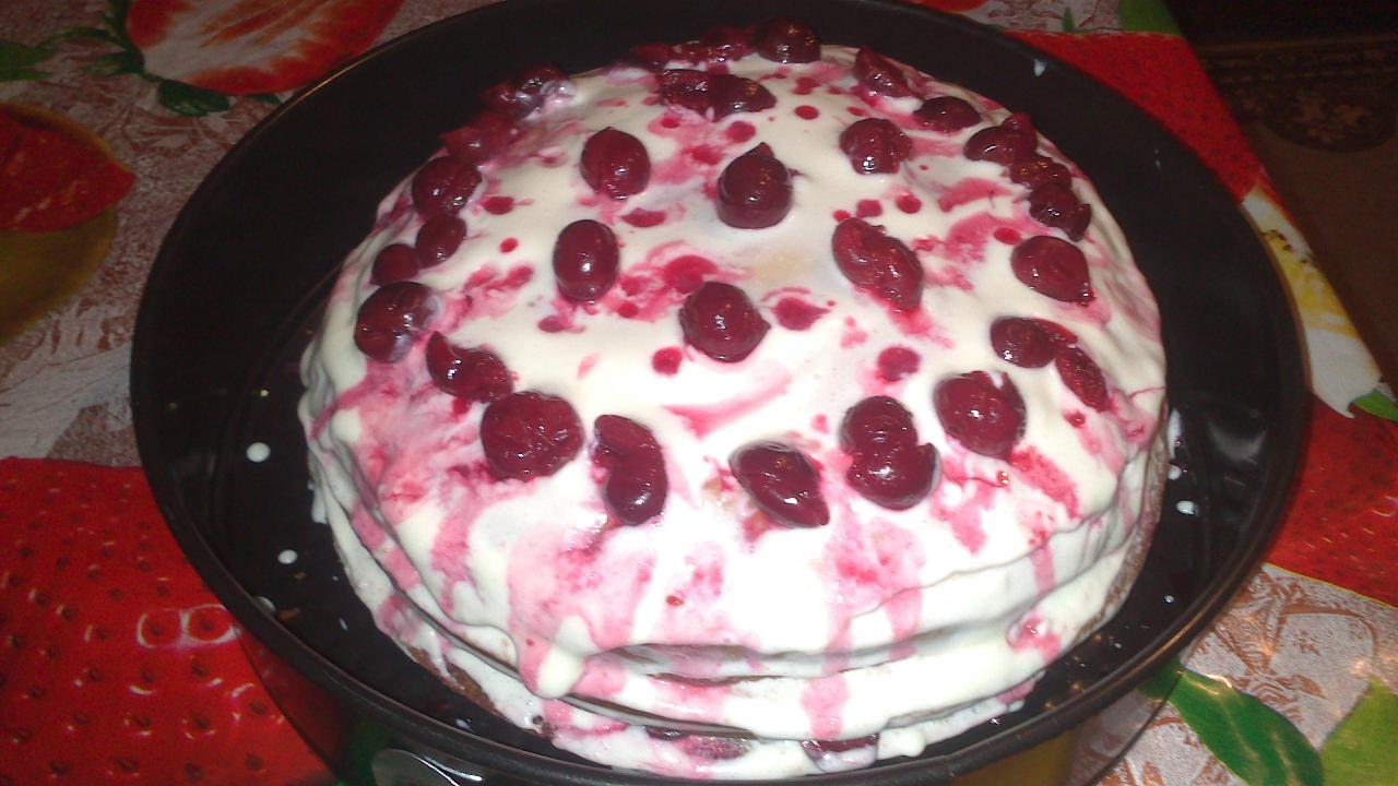 Внутри: размороженная вишня, удалила косточки, добавила водички с сахаром и закипятила все вместе для пропитки коржей.
