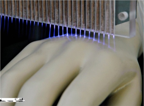 когда то видел похожий прибор со стеклянными насадками различными (расческа, трубочка), когда подводишь его к коже (он для этого и был создан) то так же выглядело - искорки образовывались между кожей и телом