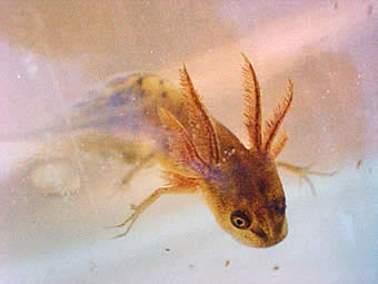 Перистые выросты на голове - это наружные жабры, чтобы дышать под водой. Когда личинка превратится во взрослое животное, они исчезут.