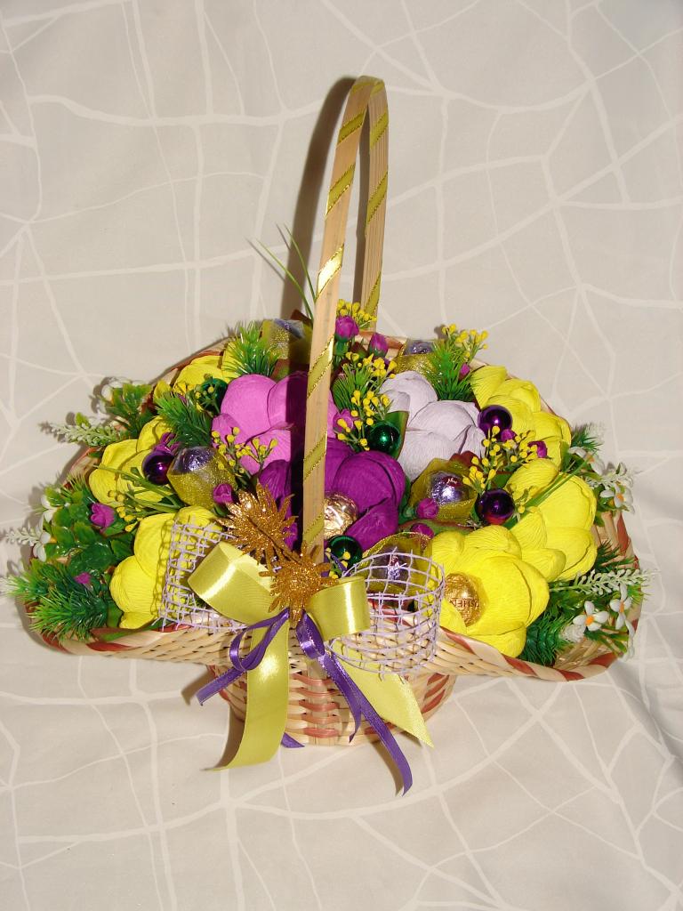Большая корзина желто-фиолетовых крокусов"Сказка в корзине Вернисаж" №35 c конфетами ferrero rocher и Esfero