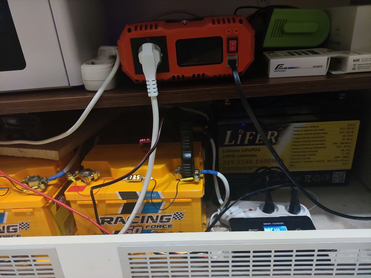 Прошлую зиму на 4х автомобильных аккумуляторах прожил. Комп целый день, телевизор+освещение вечером. Недавно аккум LiFePO4 на 1400 ватт*час докупил. Но это оффтоп. Я вот чего в принципе сказать хотел - если кто-то покупает инвертер, то он рассчитывает подключить ещё какую-то другую технику ибо питать только роутер с онушкой совершенно никакого смысла нет, их можно напрямую к тому же аккуму от упса подключить или повербанку какому.