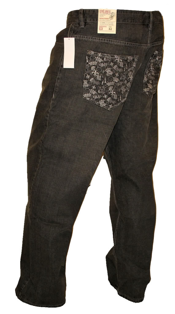 Хм. Хороший какой вопросДело в том, что я ношу одну модель в 34-м, которая идет на самом деле как 36-й. А вообще 34-й у них носит мой муж, размеры которого я не помню. И потом, все бэгги у Эко различаются по габаритам, их нужно мерить индивидуально, на иБее это обычно пишут по конкретной паре, включая длину.
