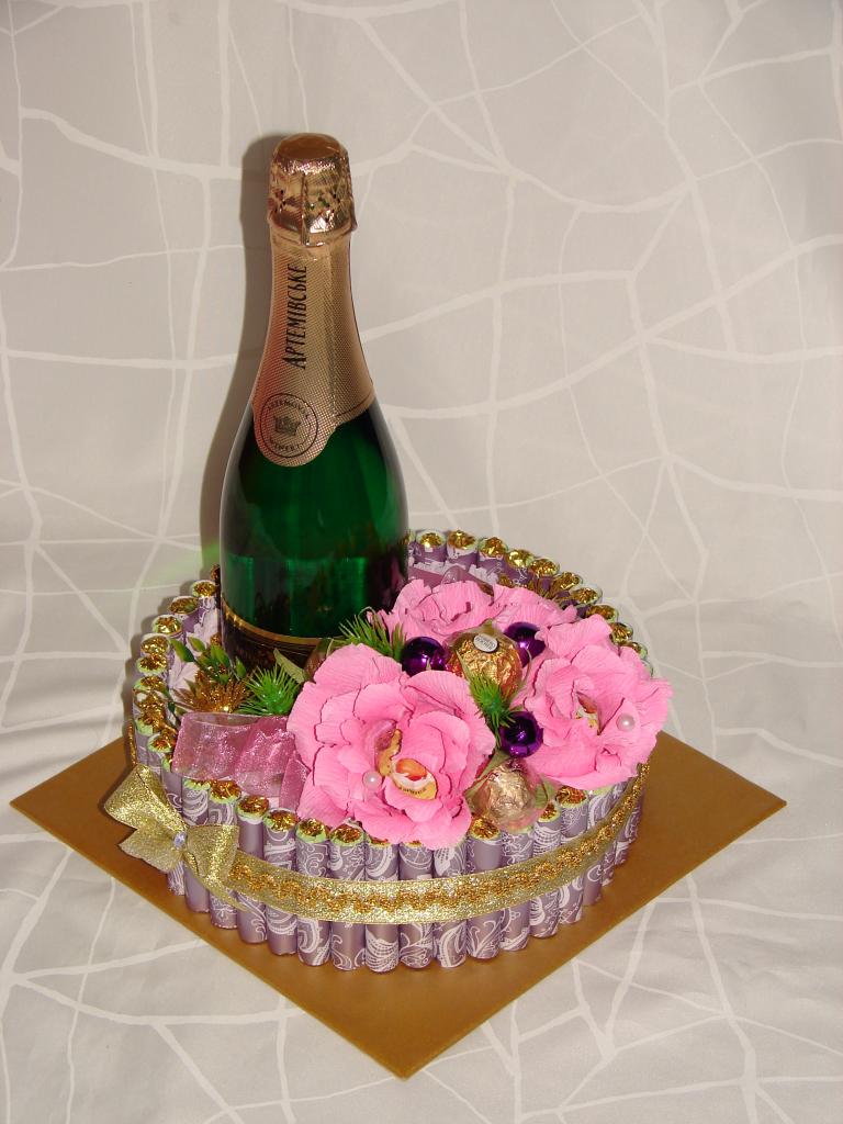 торт-шкатулка из конфет к 2015 году с синими цветами и подковой