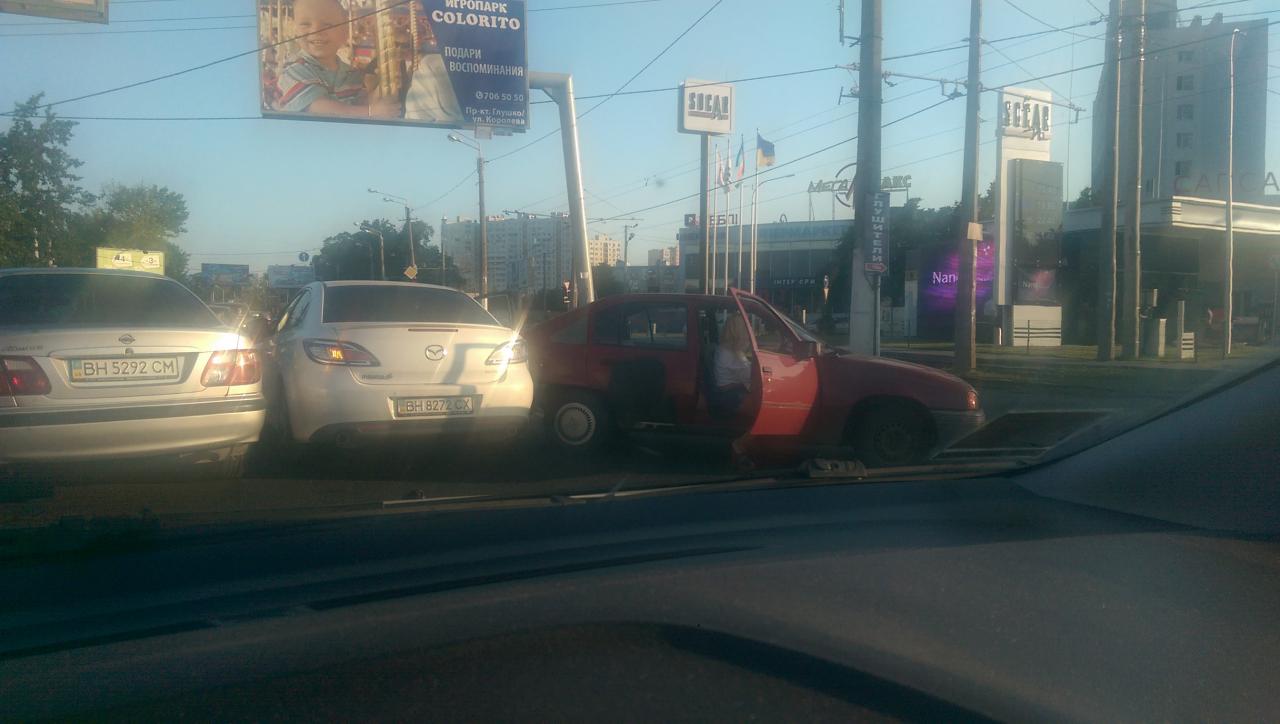 И дабы не офф: на Среднефонтанской ул. (в районе шиномонтажа) в средней полосе стоит Лексус RX без колеса, а в левой полосе что-то типа Рено Кангу на аварийках.