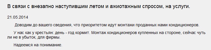 )Улыбнула). Хотел бы выяснить, так легче простого попросил бы знакомых отписать чот типа нужна кондишка)) и на очередной ваш советую тот то " никому не верю, вам верю, да хочу , дайте две, продайте мне")). От только мне честно говоря это не интересно, последнее время просто улыбают ваши посты( в данном варианте сказали бы " скидку даем на под ключ" и слова бы не сказал так как техника компенсирует ту десятку, а когда говоря скину десятку на монтаж коли пара), да ради бога мало ли мотажеров готовых как каторжный пахать за двести гривен), тут уж персональное дело каждого ценить свой персонал аль искать рабов