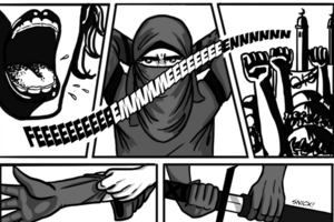 Но несмотря на объединяющую их борьбу за права женщин, Каира не приемлет методы и идеологию Femen. Поэтому острый меч Каиры настигает полуголых активисток движения, которые оскверняют святыни ислама.