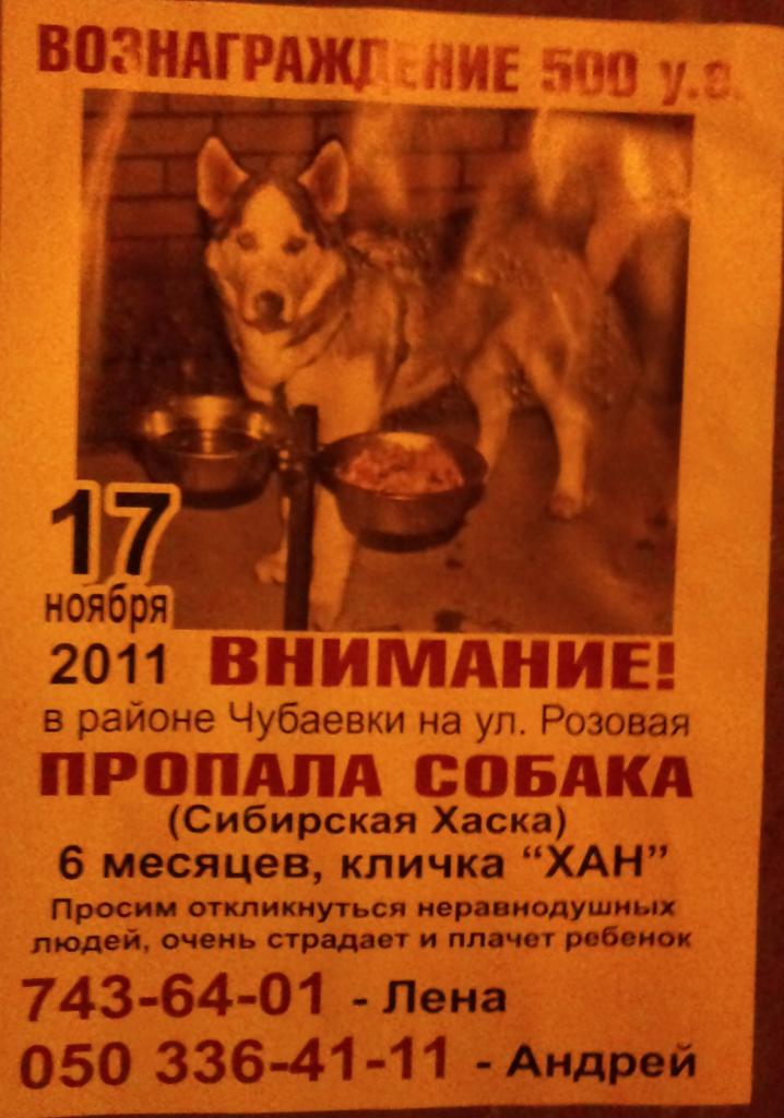 Весь район Чубаевки обклеен сообщениями о пропавшей собаке!!! Если кто-то Видел откликнитесь!!! цитирую: