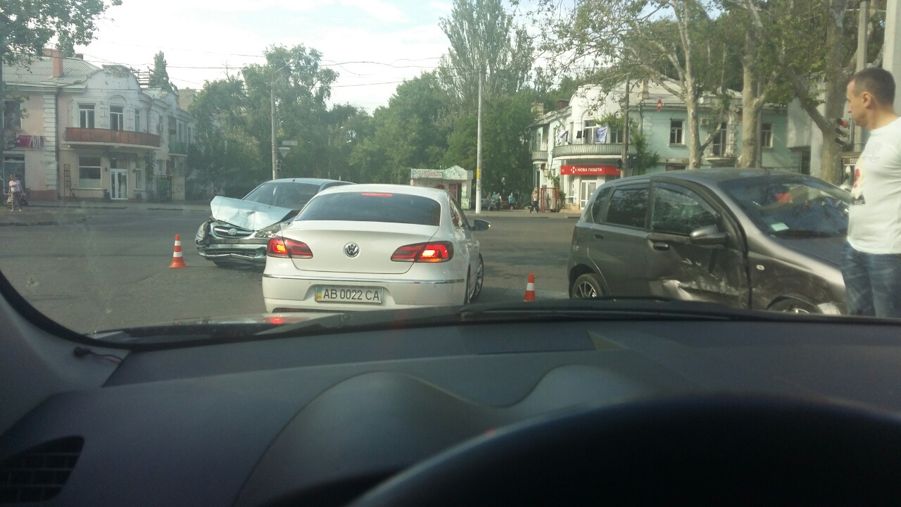 Часов в 17, Адмиральский угол Шклярука, Хендай и Авео (по-моему), кто то на красный хотел проскочить. Авео в столбе, Хендай дымился. В Авео явно был постадавший, вокруг много людей было и полиция присутствовала. Надеюсь с водителем Авео все в порядке.