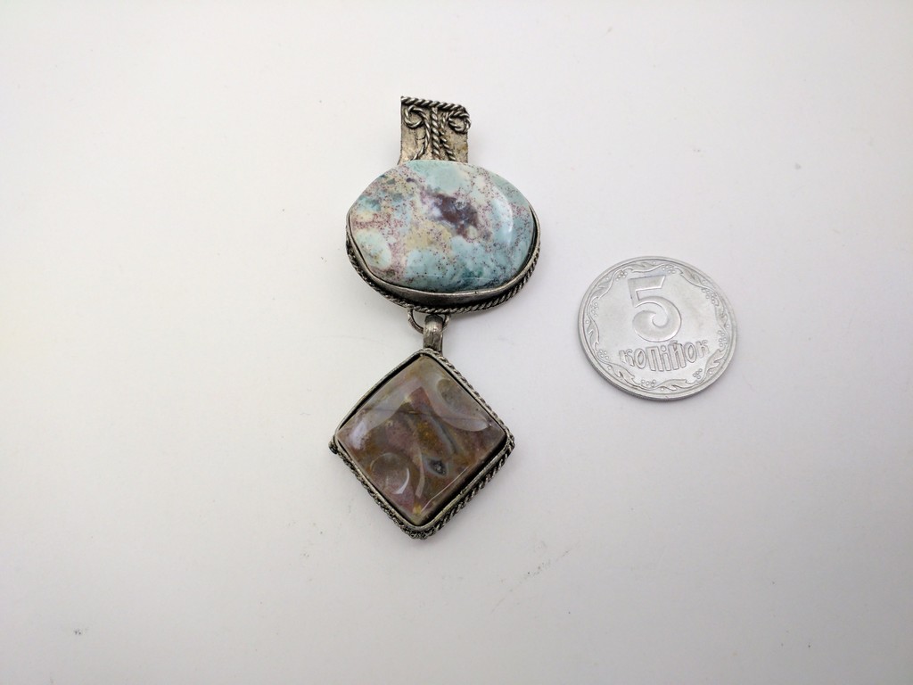 Сверху - ларимар не очень хорошего качества, снизу - халцедон. Что-то из его группы.