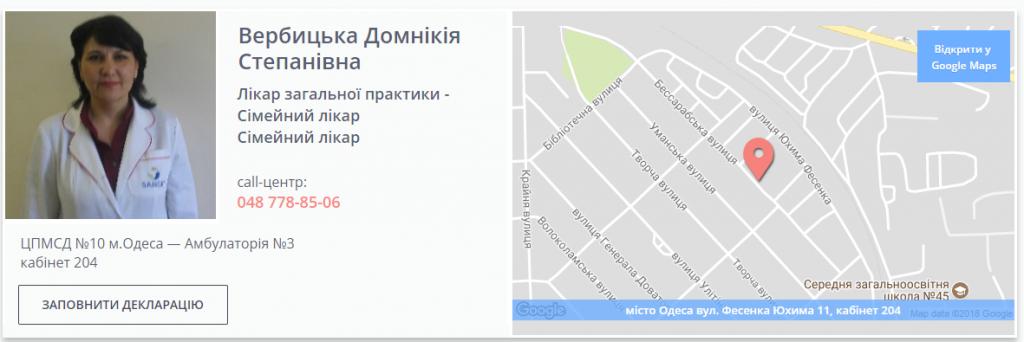 Одеський міський центр перинної медико-санітарної допомоги № 10 Сімейний лікар Вербицька ДОМНІКІЯ Степанівна