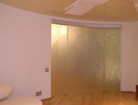 Камелот делает двери из каленого стекла раздвижные, включая радиусные. Очень красиво.