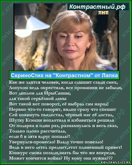 Когда ВенцешкО и Токарево орались и ругались (сил нет слушать эту истеричку недорезанную и этого дЭбила).......и Дрались!!!!......ближе к концу Венц крепко держал Катю , она бил его капустой (как романтишно), а этот ур*д ухватился а нее и целовал ее в шею......причем, девочки, он не пытался ее успокоить, он конкретно возбудился и страстно целовал Катю в шею.....томно шептая ей "Я люблю тебя".....