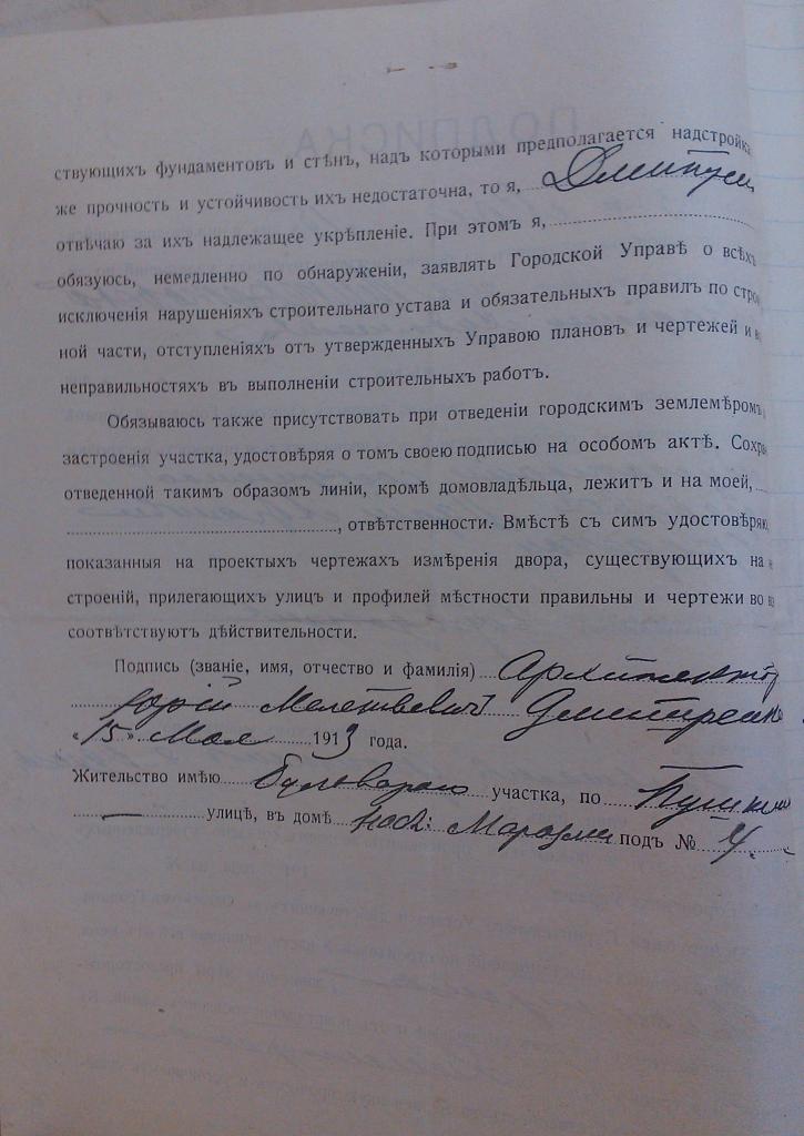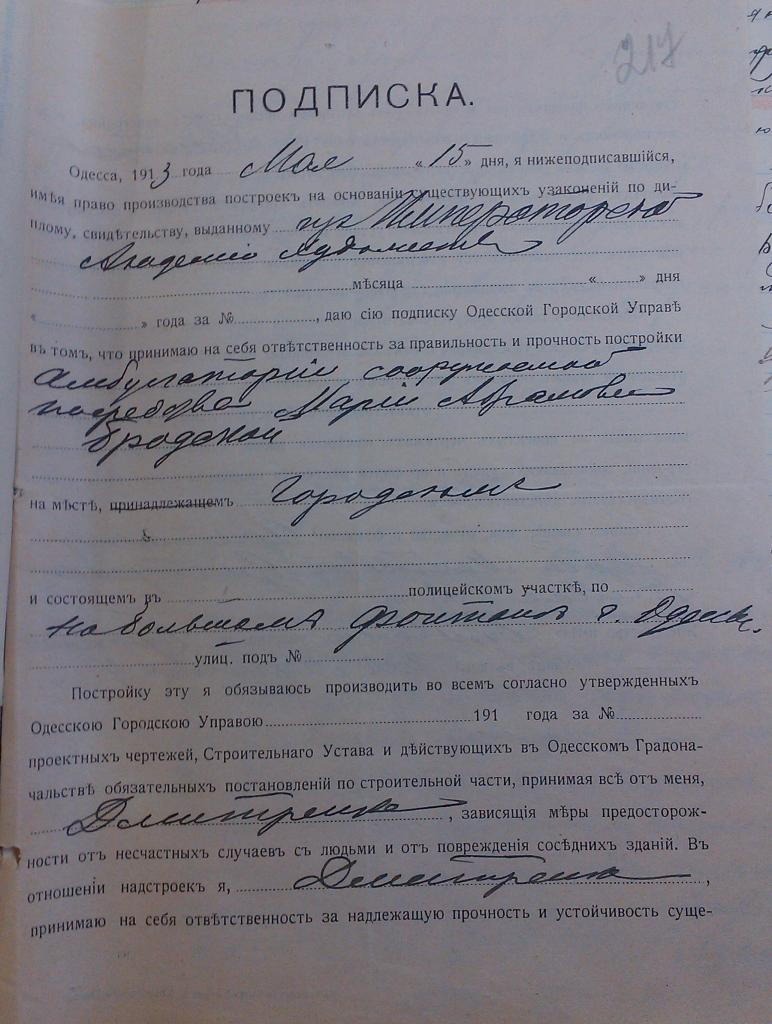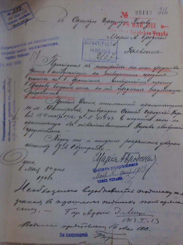 Амбулатория Бродской на 16 ст. Фонтана. Прошение М. Бродской о начале строительства (1913) и подписка архитектора Дмитриенко