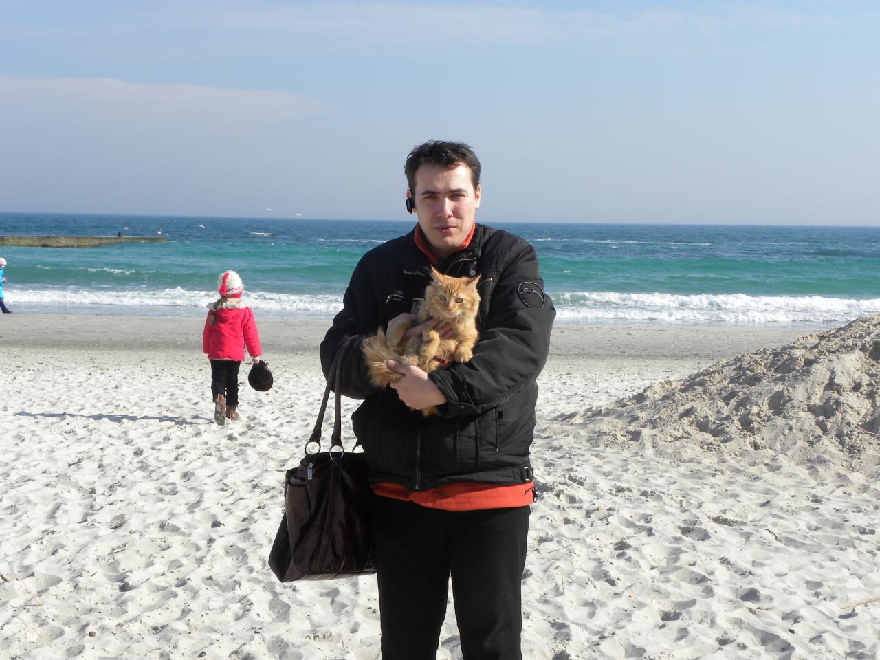 это мы на фонтане, возле "Зебры". перепугался, сначала прятался под мой плащ, потом в сам плащ попросился))) ветер и шум моря его напугал изрядно
