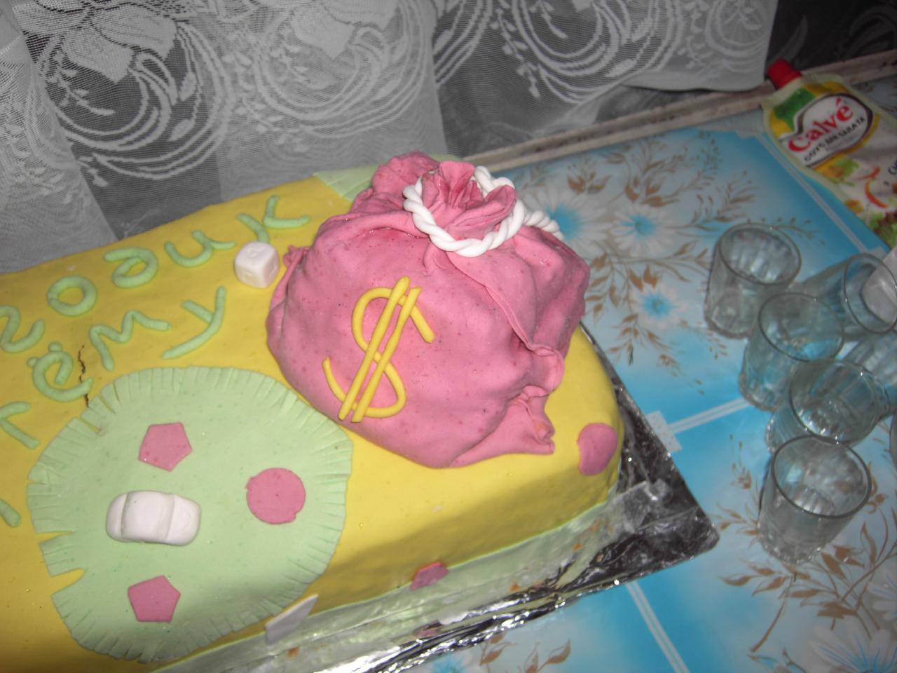 Коржи - 2 обычного бисквита, 2 - шоколадного, вишня в собственном соку, крем - сметана 21% взбитая с сахаром, для выравнивания краев и приклеивания мастики - сгущенка-ириска, мастика из маршмелоу (краска фабричная), тапки из мастики желатиновой с какао. К сожалению, забыла срез сфоткать((( трещинка образовалась при перевозке из-за того, что торт на картонке, а не подносе...