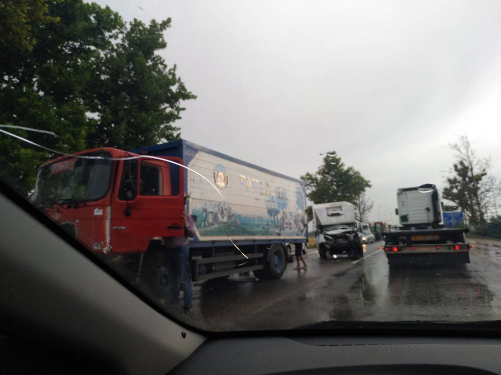 На мосту в правом ряду стояла фура на аварийках, за ней фолькс менял колесо, за ним Паджерик на аварийках, все целые... фура отъехала, остальные остались, занимают правый ряд...