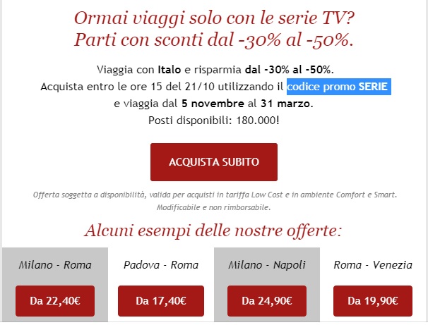 Видео содержит уже не совсем актуальную информацию. Промокоды у Italo сейчас есть каждую неделю. В пятницу в районе обеда зарегистрированным пользователям приходит письмо с промокодом, его же можно узнать и не регистрируясь на сайте - достаточно зайти на страницу Italo в facebook (https://uk-ua.facebook.com/ItaloTreno). Желательно пользоваться промокодами как можно быстрее, т.к. количество мест ограничено. В сезон реальные скидки на данный момент - до 25%, в несезон можно рассчитывать и на 30-40% (в прошлом году изредка бывало 50%).