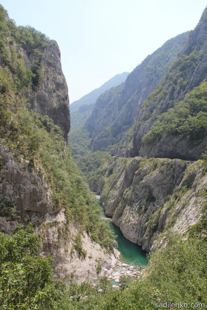 платной рыбалкой), мы же просто полюбовались на виды озера из местного ресторана под незатейливым названием "Джезеро"(на ресторане красовалось 4 звезды, цены были соответствующие), выпили по чашке кофе и съели местный чизкейк, кстати, очень достойный.На берегу озера сидели под зонтиками местные рыбаки, а над ними на железной дороге прогромыхал такой себе апокалиптический поезд(смотри фото), в общем живописно. Далее мы поехали в каньон реки Морача, но будьте готовы, что знойным летом вы не увидите ни той многоводной голубой Морачи, ни даже Тары, которую рисуют на проспектах, от зноя реки обмелели и стали похожи на свои бледные копии.Но сами каньоны, конечно, заслуживают внимания, они фантастичны, головокружительны, полны жизни- я не только про цветы, травы и деревья, умудряющиеся прорастать на отвесных скалах, внизу, в долинах, стоят домики, пасется скот, просто удивительно, как они умудряются существовать здесь зимой, как их не засыпает полностью снегом и не затапливает весной паводок.