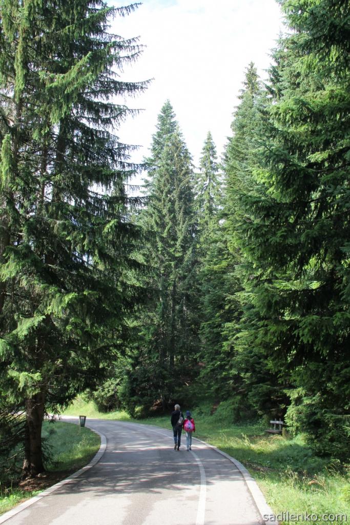 В парк вела широкая асфальтовая дорога с лавочками по бокам и урнами для мусора, по сторонам от нее был опять-таки великолепный грандиозный лес с 400сотлетними соснами и елями, взмывавшими в небо, аромат стоял совершенно непередаваемый, это был какой-то разлитый в холодном звонком горном воздухе смолистый еловый концентрат, надышаться невозможно. И как-то повезло, что совсем не было туристических групп, можно было насладиться невероятной тишиной, которую разрывало только ликующее птичье пение. Кроме широкой облагороженной дороги, в лесу есть множество туристических троп(отмечены