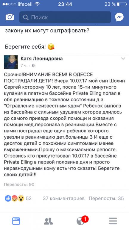Срочно!ВНИМАНИЕ ВСЕМ! В ОДЕССЕ ПОСТРАДАЛИ ДЕТИ! Вчера 10.07.17 мой сын Шохин Сергей которому 10 лет, после 15-ти минутного купания в платном бассейне Private Elling попал в обл.реанимацию в тяжелом состоянии д.з "Отравление неизвестным ядом" Ребенок выполз из бассейна с сильным удушием которое длилось до самого приезда скорой помощи и оказания помощи мед.персонала в реанимации.Вместе с нами пострадал еще один ребенок которого увезли в реанимацию дет.больницы 3 И еще с десяток детей с похожими симптомами менее выраженными.Прошу о максимальном репосте. Отзовись кто присутствовал 10.07.17 в бассейне Private Elling в первой половине дня и просто неравнодушным кому есть что сказать! Берегите своих детей!!!