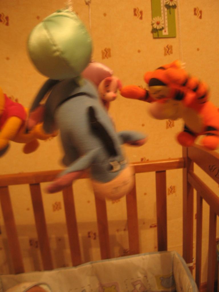 Мобиль у нас обычный, без мызики, не крутится-просто висит себе красивый.У нас несколько было, но один я подарила, один сестре отдала, вот в закромах нашла)Тетя из америки привезла.