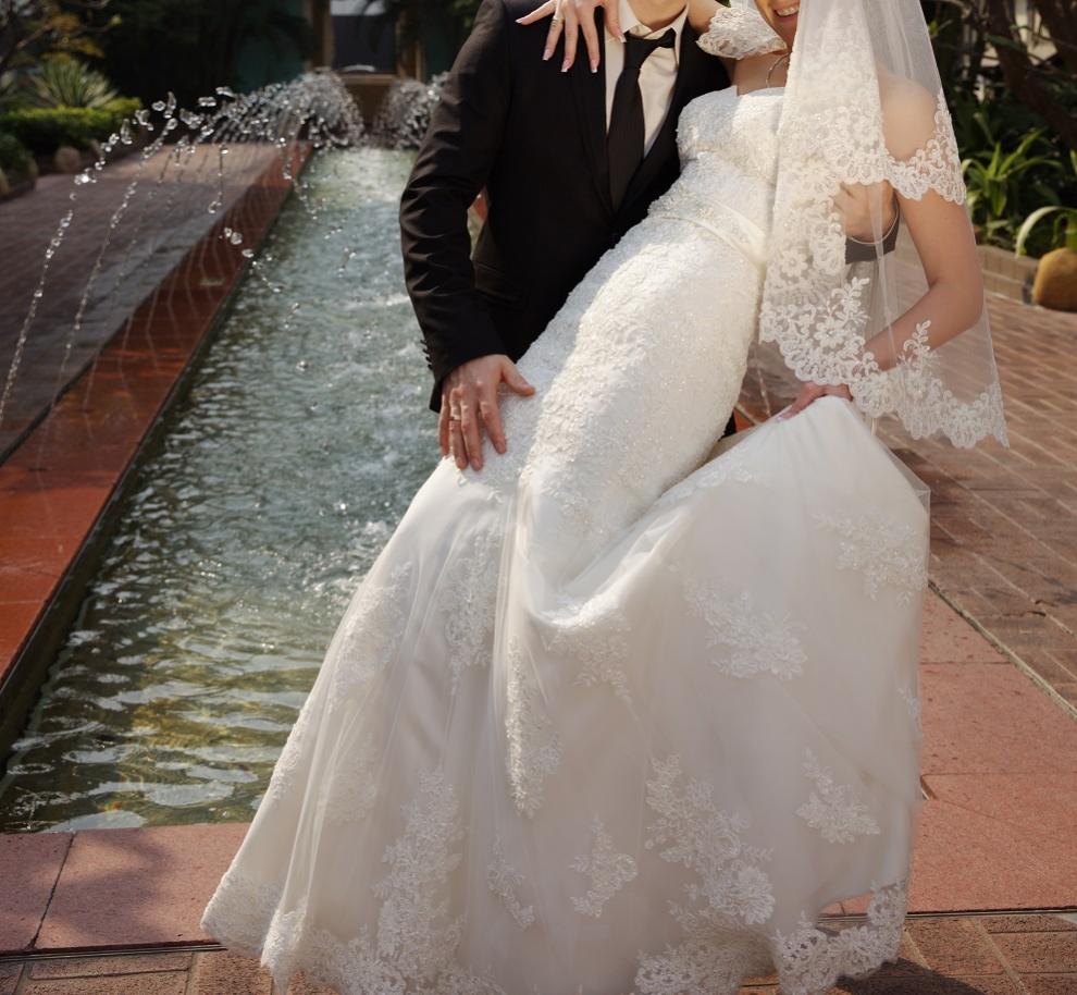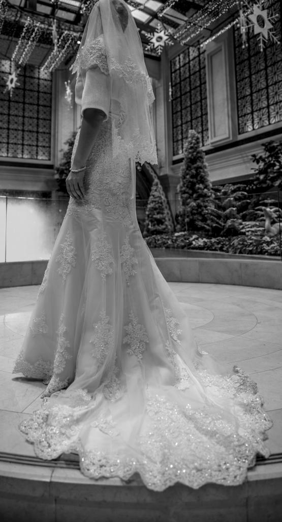 Платье цельное, А-силуэта с шикарным шлейфом, корсет на шнуровке, нежнейшее кружево, всё усыпано мерцающим бисером, пояс в наличии кораллового цвета, четырёхслойное.