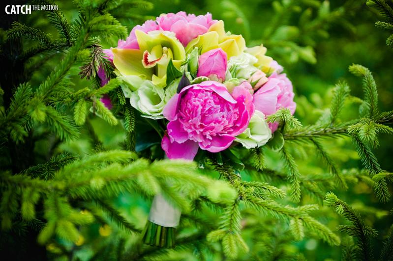 и вот еще шикарный букет с пионом малиновым, эустомой и орхами!)