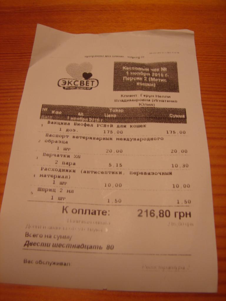 Через 2 недели снова на осмотр. В клинике потрачено 177 грн (это прием, анализ и адвантейдж от блох). В аптеке куплено 10 капсул клиндамицина за 46 грн.