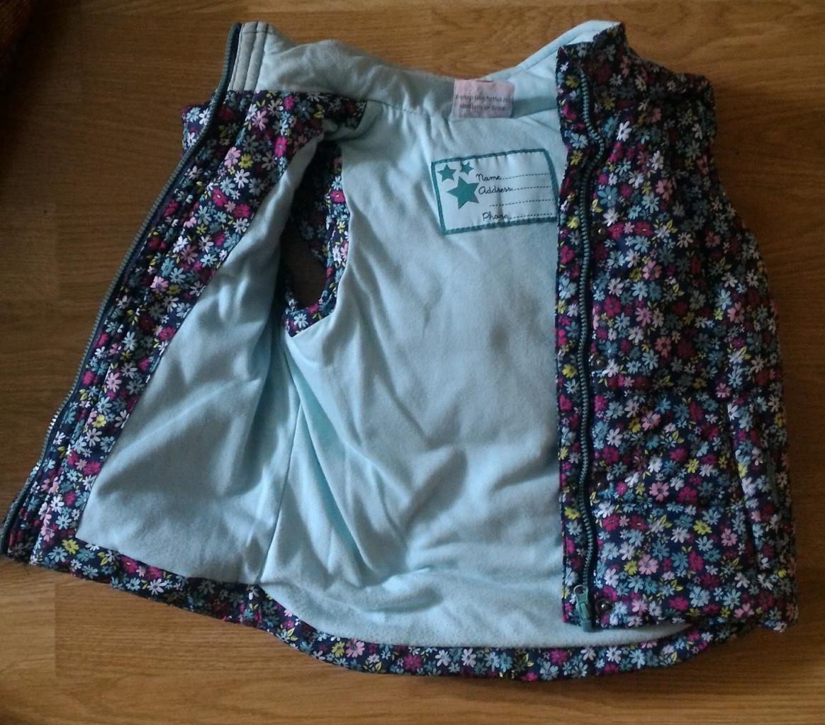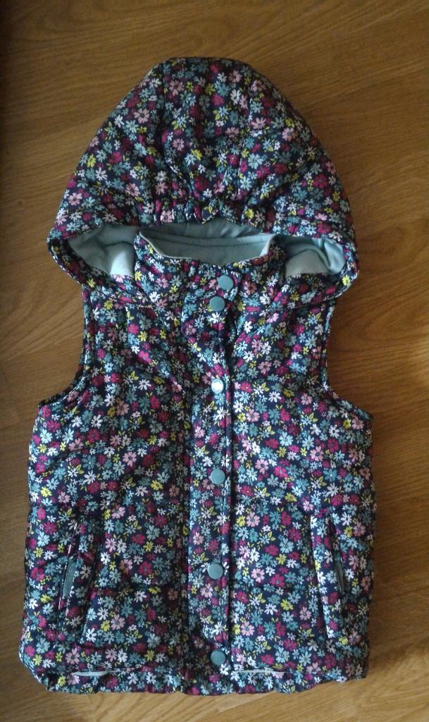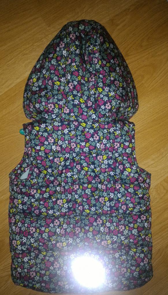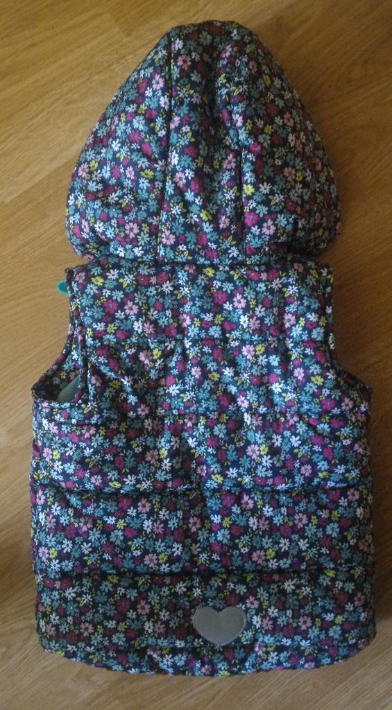 На синтепоне, застегивается на змейку и кнопочки под горлышко, капюшон пришит. Сзади светоотражающая апликация. Заказывали в Германии. Носили очень мало, состояние новой.