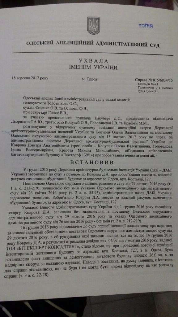 18.09.2017г. решением Одесского Окружного Апелляционного суда поставлена точка в деле касательно нахалстроя по ул.Костанди, 127 СК "Фамильный Дом". Дом идет под снос!