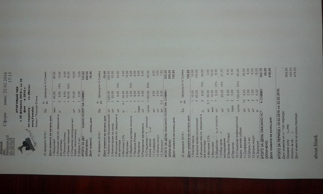 Была у Алисочки в гостях. Лечимся, пока больших результатов нет, но только потому что она очень запущена и надо много времени... Еще вчера взяли анализ кала,потому что она пропоносила. Но мы думаем, что это из-за дачи антибиотика. Но на всякий случай перестраховываемся. Завтра постараюсь опять заскочить в гости, взять результат анализа и новый чек...