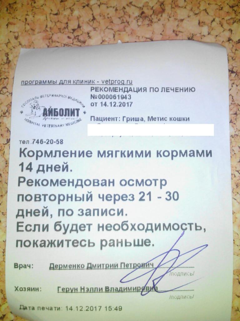 Приехали домой, Гриша нормально себя чувствует. Я нашла у себя в заначке баночку гурмет голда(не паштет), размяла вилкой и дала ему.
