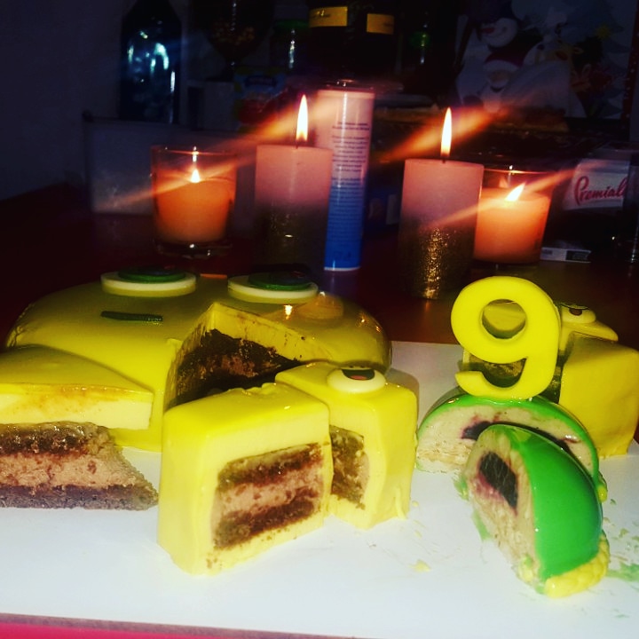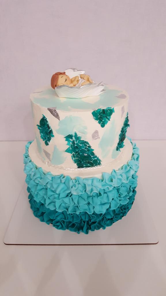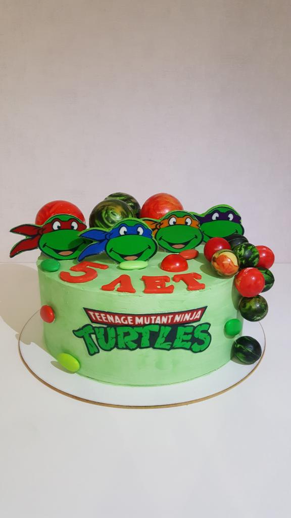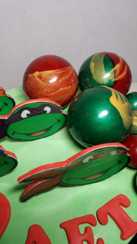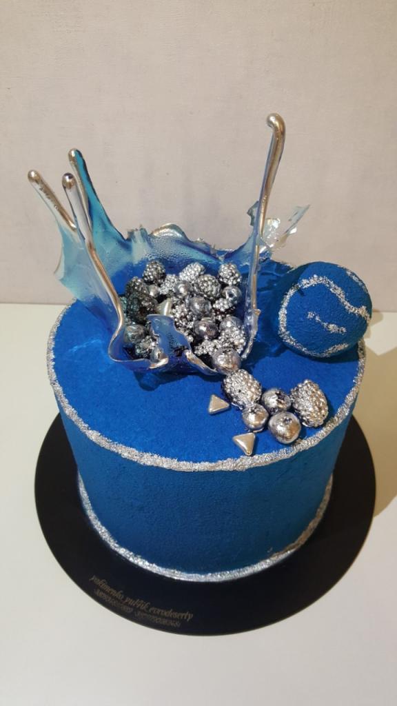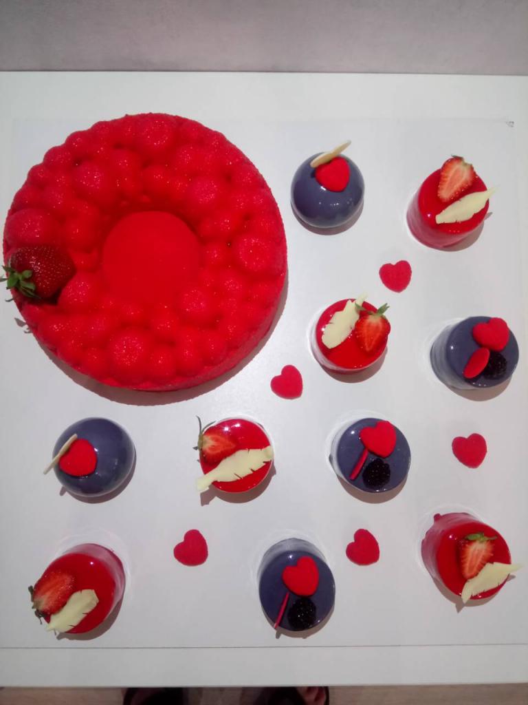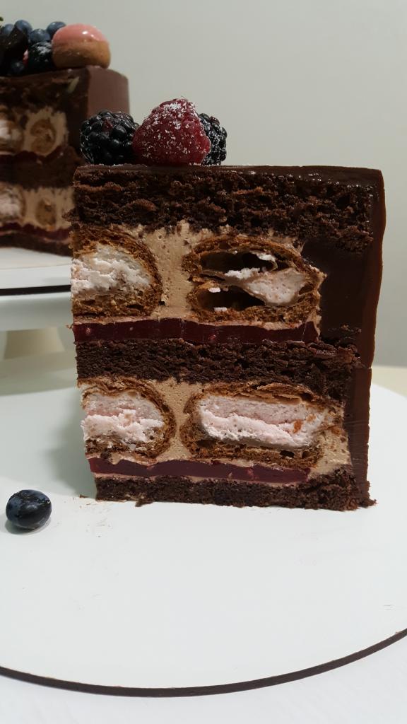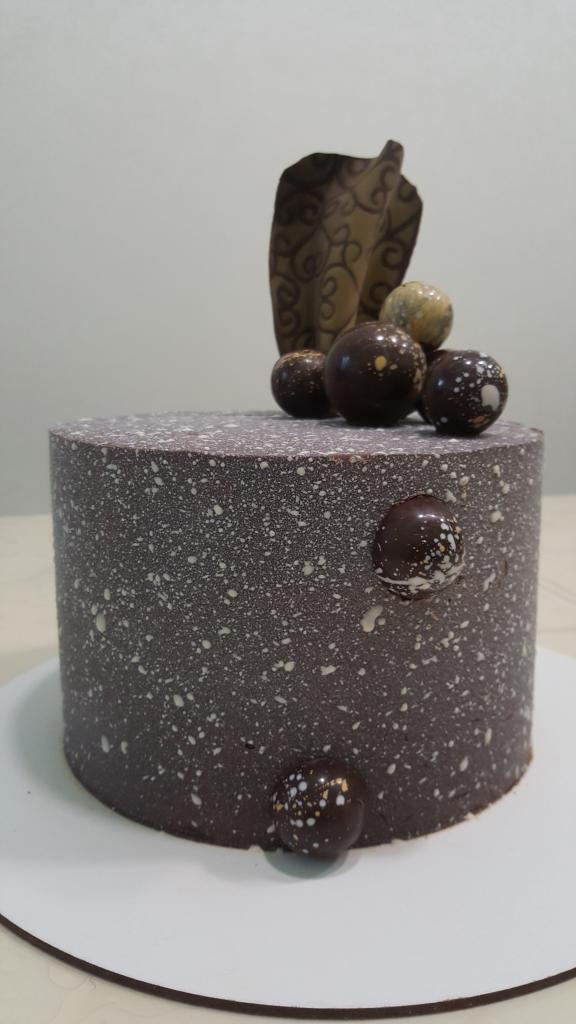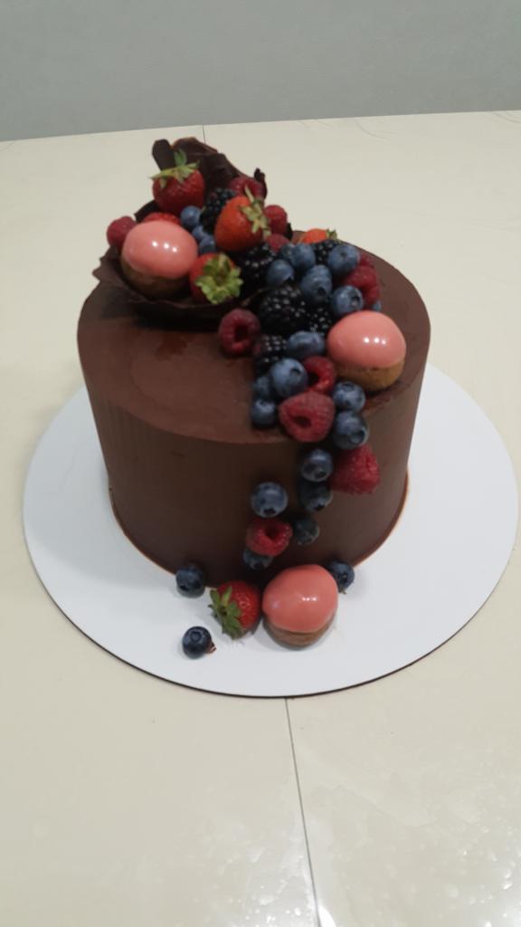 Фисташковый бисквит,фисташковый крем,клубничное комфи и ягоды клубники,шоколадные шары