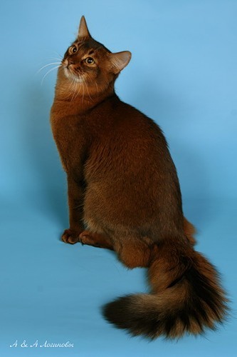 Вообще мы сами 1,5 года не знали, что у нас породистый кот))))) Мы когда-то отдыхали на гидрометовской базе (будучи студентами с мужем), в Шампанском переулке на спуске к пляжу "Дельфин", а там как вы знаете, ну ОЧЕНЬ круты дома... И "базовская" кошка привела 8!! котят. Все были очень дикие в том числе и сама мама-кошка, к людям не подходили... Я их подкармливала и вот один единственный котенок, самы уродливый, с огромными (как у осла) ушами, пошел на руки. В общем, когда мы съезжали с базы, решили забрать его себе домой. Назвали мы его Бароном и со временем из него вырос настоящий БАРОН... Через 1,5 года, сложилась не приятная ситуация и нам пришлось срочно ехать в ветеринарку делать операцию коту (по мужским делам). После 2-х часового наркоза, выходит ко мне ветврач и требует у меня документы (паспорт), я в шоке, не могу понять, что он от меня хочет. Какой паспорт? Зачем вам мой паспорт? Он посмотрел на меня как на дуру и говорит: "Девушка, не ваш, а кота". Я говорю: "Какие документы? Мы его на улице нашли", а он мне: "Как??!! Вы знаете, что у вас за чудо живет? И начинает мне рассказывать про Сомали... А он оказывается ярый фанат этой породы". В общем вот так мы узнали, что у нас полупородистый кот, единственное, что у него не от Сомали - это белый живот - в этой породе это дисквалификация... Допускается только на морде белые пятна...