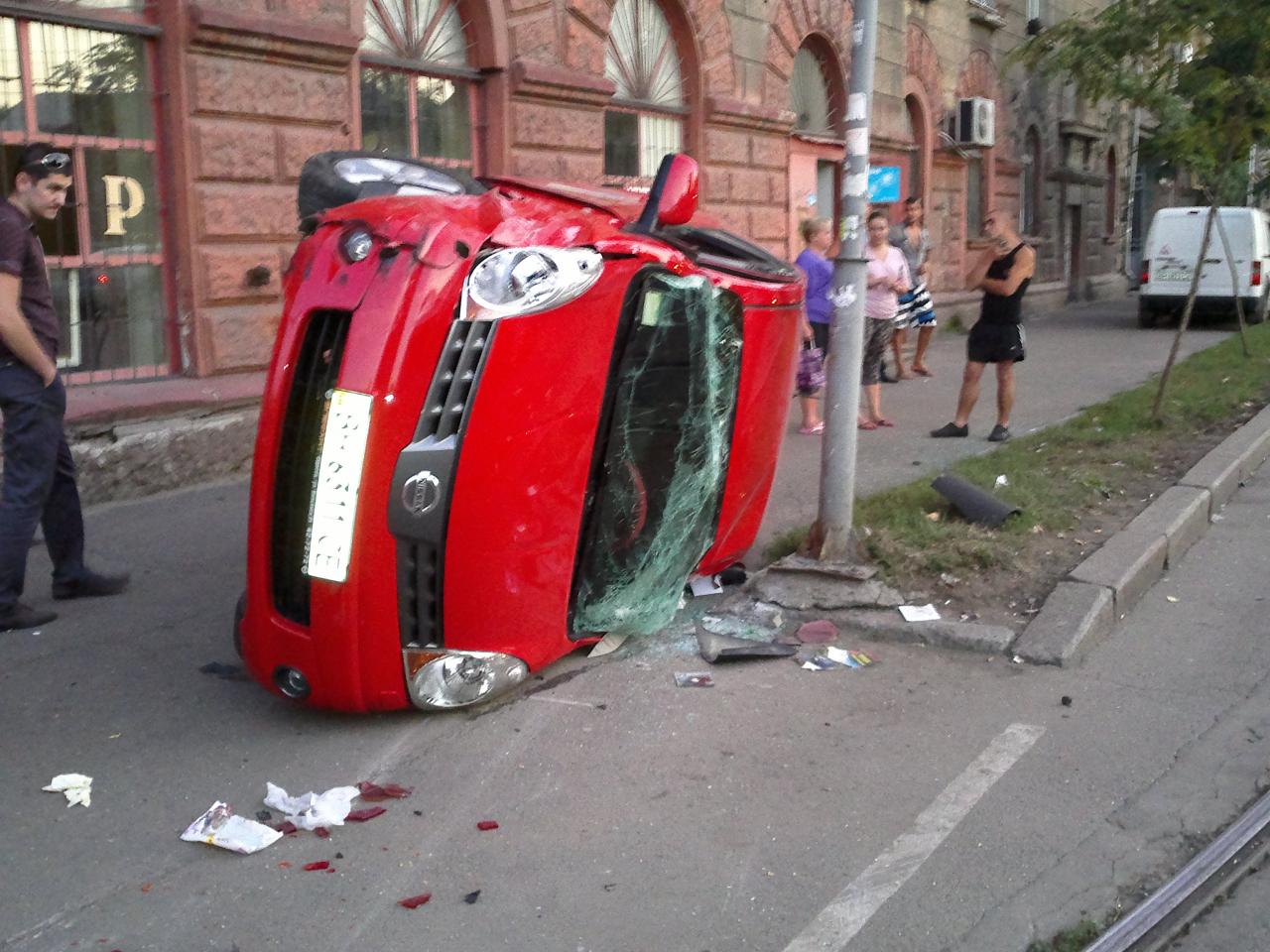 Ford Focus двигающийся по Головатого "зафутболил" Nissan Note. Nissan от удара улетел на тротуар за трамвайные пути к магазину и замер лежащим на боку и упирающемся между зданием и светофорным объектом. Повреждения обоих авто серьёзные.