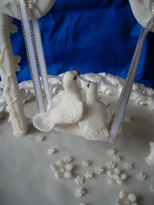 Свадебный торт, первый и второй ярус песочные коржи+сметанный крем, прослойки чернослив, курага, вишня в коньяке, орехи, безе со сгущенкой. Ярус для молодоженов "Птичье молоко". Вес 17 кг. Первый ярус диаметр 50 см, второй ярус - 30 см, третий ярус -20 см. Украшен сахарной мастикой, арка и голуби из сахарной мастики.