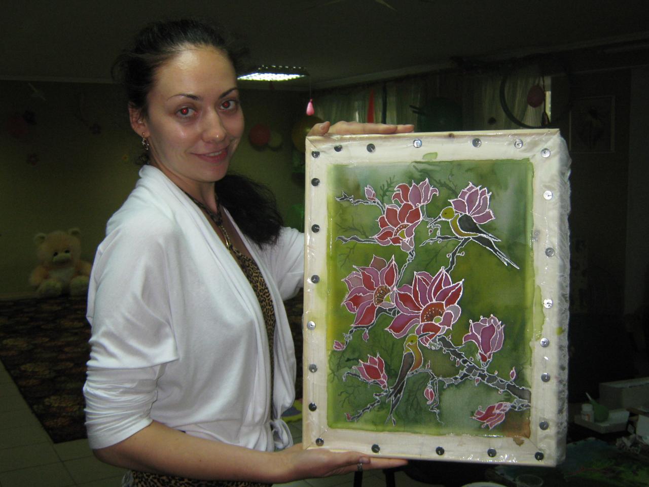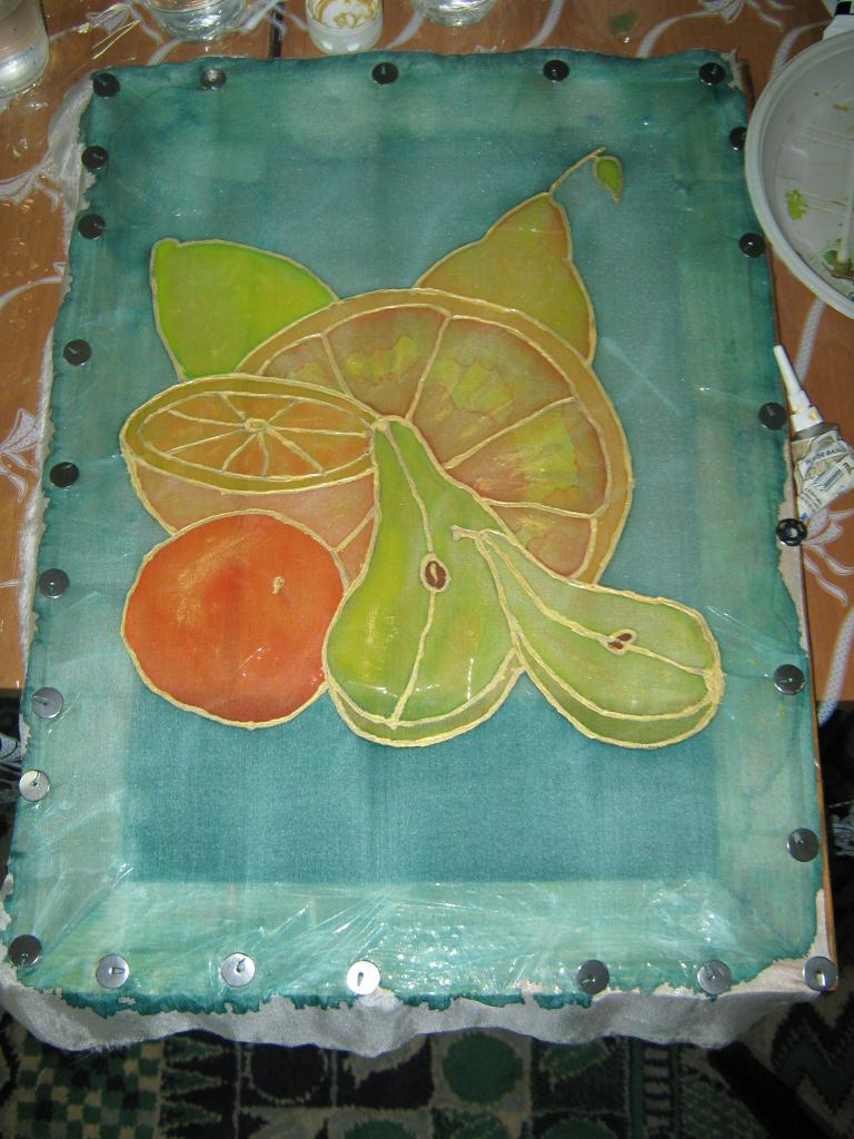 Под приятную релаксовую музыку постепенно белый кусочек шелка превратился в невероятно красивый рисунок. Уже не терпится поскорее оформить свою работу и повесить на стену)))