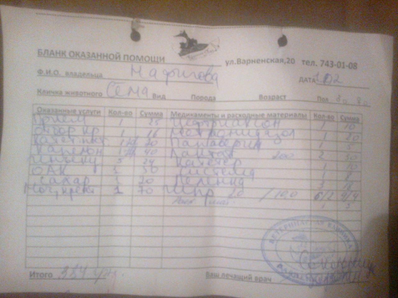 долг 904 грн...Сема дома,похудел очень,бока бритые,попа бритая,лапы исколотые...УЗИ показало в мочевом сгустки слизи,гноя,крови,камни не просматриваются,буду надеяться,что их нет...выписали два вида антибиотиков, ношпу и ещё что-то...пить надо будет антибиотики месяц ,а может и больше.Через 10 дней анализ мочи,попозже надо будет ещё УЗИ делать...