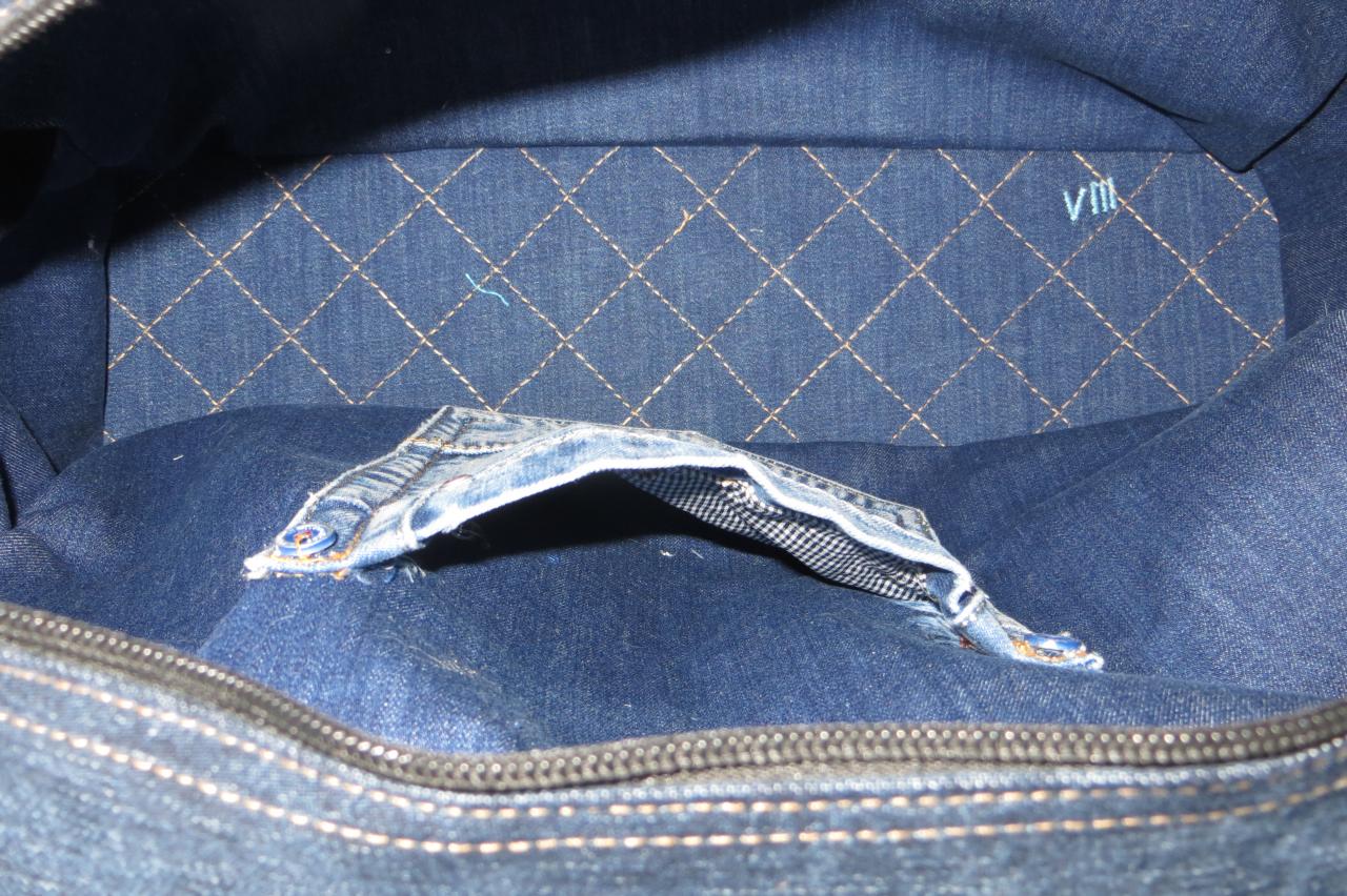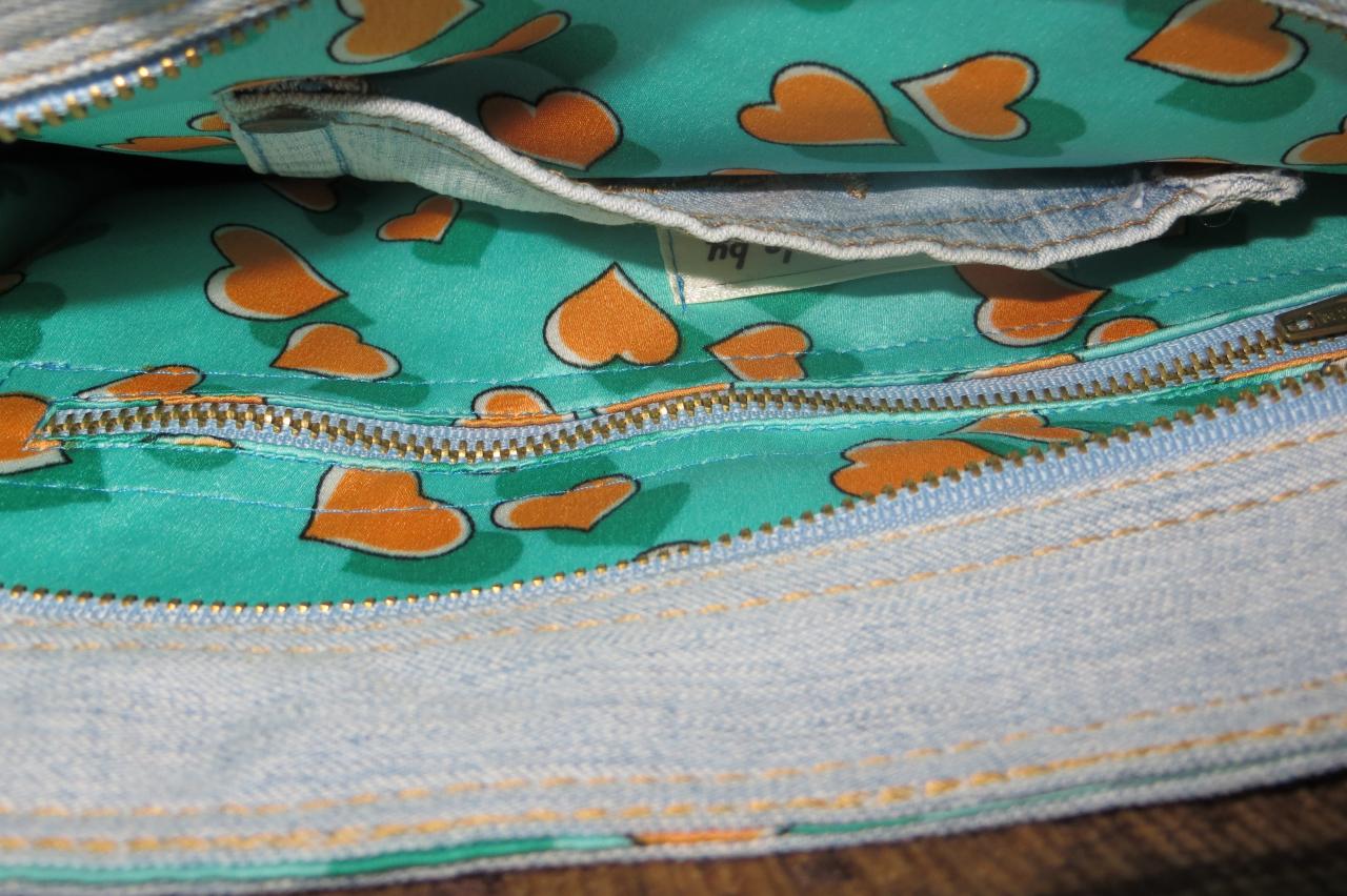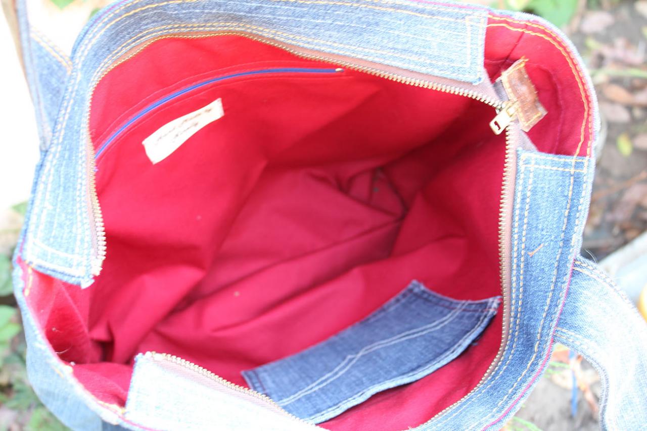 Материал - джинс, кожа. Внутри 1 отделение, внутри есть карман на змейке для документов и карман для мобильного телефона.