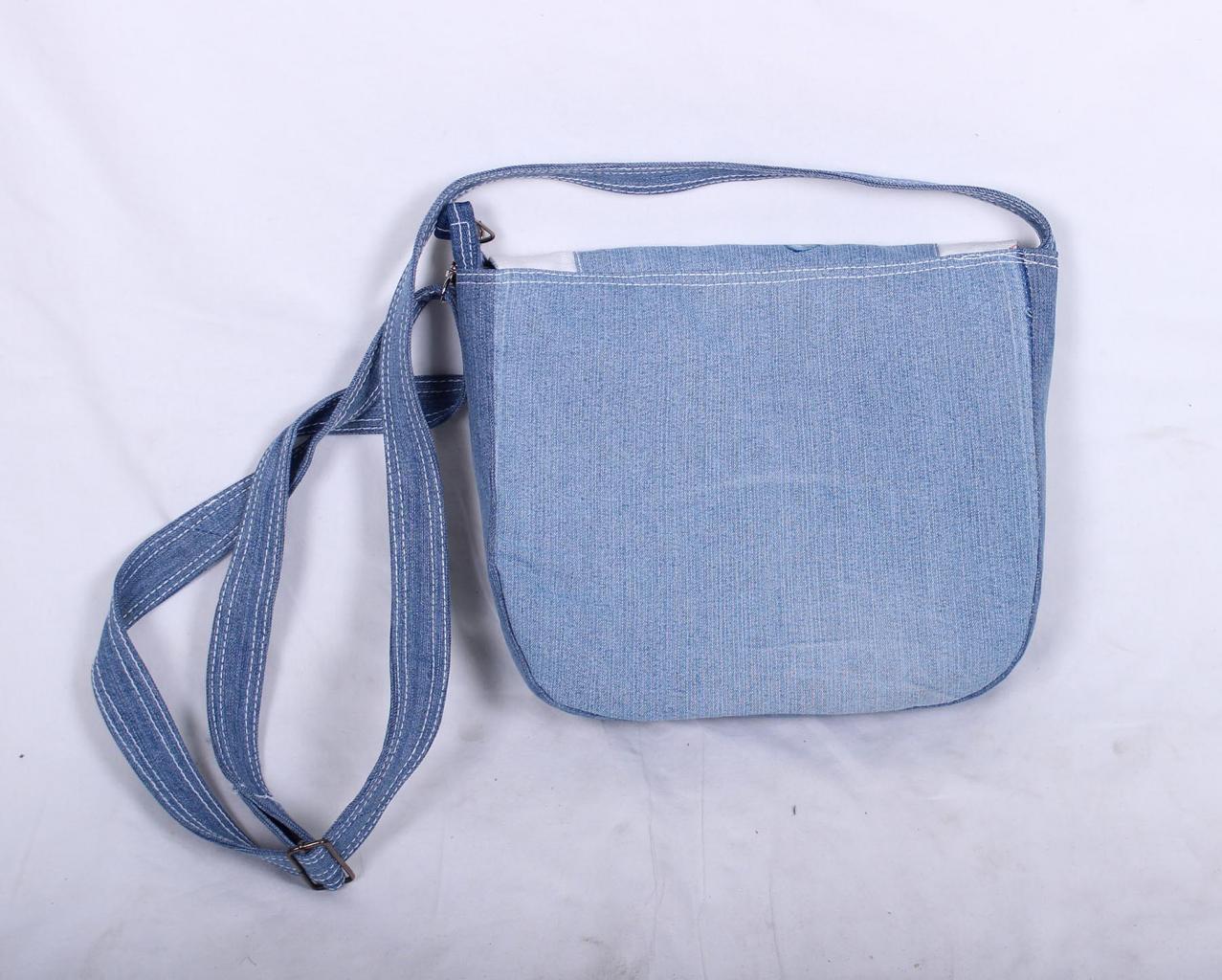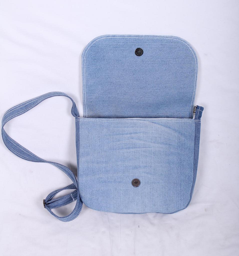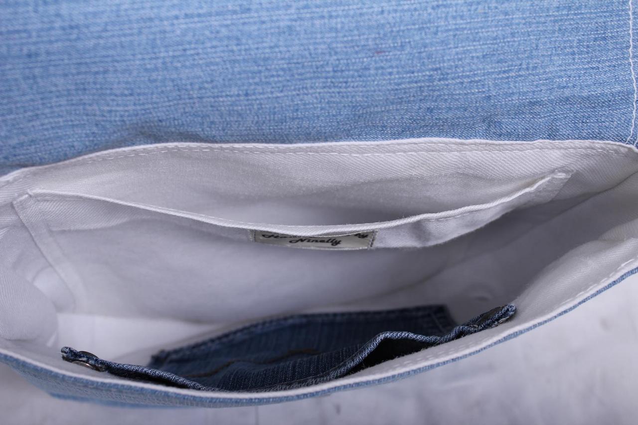 Материал Джинс, стенки сумки продублированы дублерином, что придает ей жесткости. Внутри одно отделение, есть карман для мобильного телефона, а также карман на для документов. Ремешок "через плечо", регулируемый. Закрывается на клапан с магнитной кнопкой.