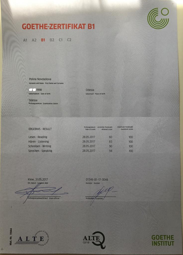 Компетенции: 2-е высшее образование ОНУ им. Мечникова (ф-т РГФ, немецкий язык и литература), выпуск 2009 года. Немецкий язык изучала в Германии на языковых курсах для иностранцев Humboldt-Institut (Sigmaringen, Berlin), Did (Berlin), GLS (Berlin) - в общей сложности 4 месяца на протяжении 4-х лет с получением по окончании обучения сертификатов прохождения пятой (C1) и шестой - самой высокой ступени (C2) - по шкале Общеевропейских компетенций владения иностранным языком (CEFR). Работала переводчиком 1 год в одесской строительной компании с представителями немецких, швейцарских предприятий. В 2014 году стажировалась в течение месяца в г. Киль (Германия) по программе международного экономического сотрудничества Федерального министерства экономики и энергетики Германии для аграрного сектора (GIZ).